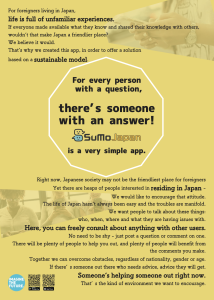 “SuMo Japan” is a bulletin board-type app where users can ask and answer questions related to different topics that they come across in the area they live in. The app is connected to the increase of foreign residents in Japan and the issues they face in their everyday lives. Together we can overcome obstacles, regardless of nationality, gender or age. If there`s someone out there who needs advice, advice they will get. Someone`s helping someone out right now. That`s the kind of environment we want to encourage. Android and iOS versions are available.