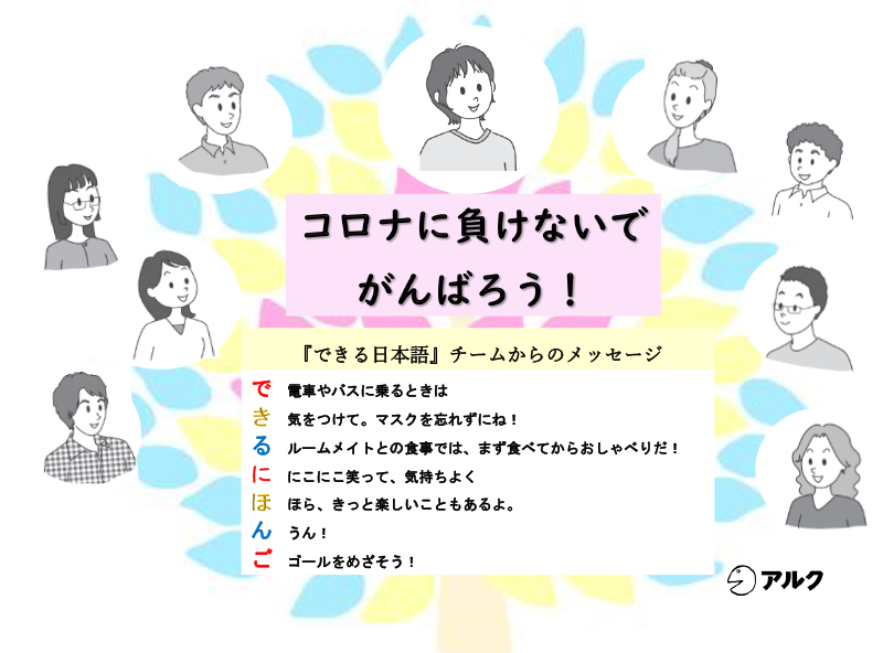 現在、「クラスメートに会えない」「思うように日本語学習ができない」と悩んでいる日本語学習者の方が世界中にいらっしゃると思います。このような状況の中で頑張っているみなさんを応援したくて日本語の教科書のキャラクター達がみなさんへの応援メッセージを発信してくれました!